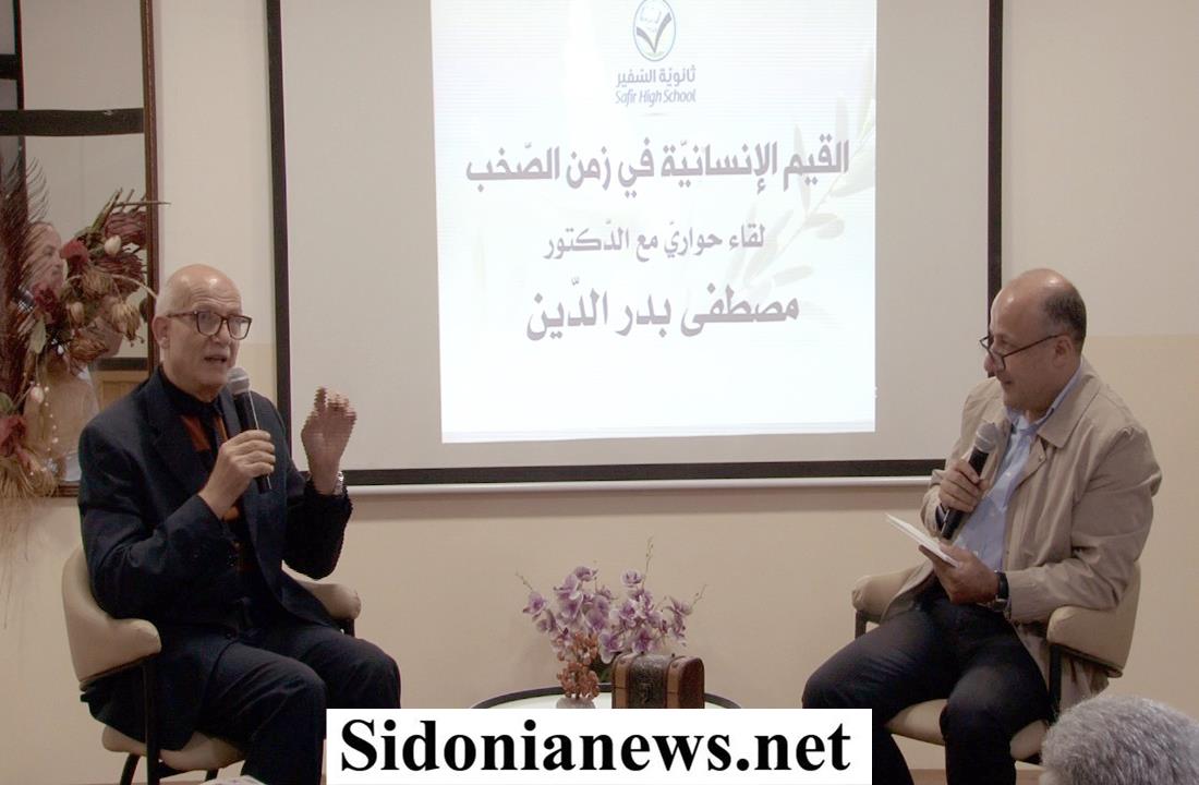 نظمت ثانوية السفير لقاءً حواريًّا مع الدكتور مصطفى بدر الدين تحت عنوان"القيم الإنسانيّة في زمن الصّخب" ، وذلك في حرم الثانوية في الغازية بمشاركة مديرها الدكتور سلطان ناصر الدين وبحضور الهيئتين الإدارية والتعليمية ومجموعة من الطلاب الذين حاوروا بدرالدين حول مسيرته المهنية والإنسانية وآرائه في العديد من المواضيع ذات الصلة برسالة الطب ببعديها الإنساني والاجتماعي.