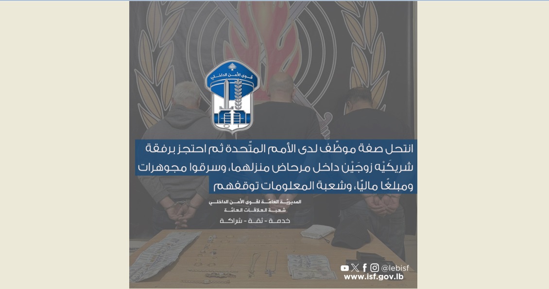جريدة صيدونيانيوز.نت / اخبار لبنان / قوى الامن الداخلي : توقيف سارق منزل انتحل صفة موظّف لدى الأمم المتّحدة وشريكيه