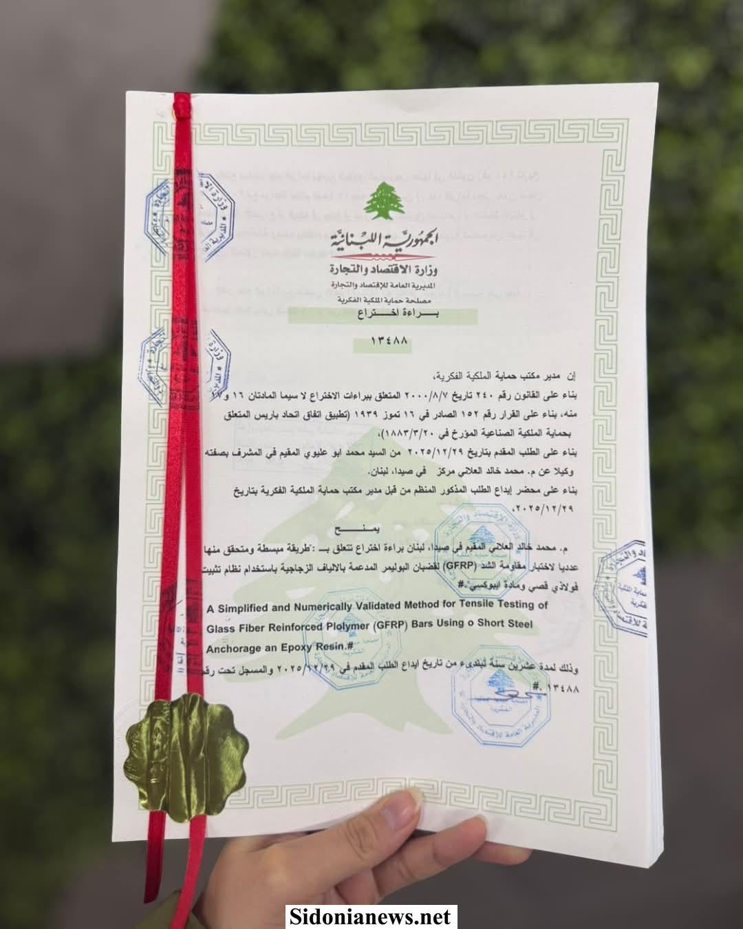 بالفيديو والصور: مبارك للصيداوي الدكتور المهندس محمد خالد العيلاني براءة إختراع لإختبار قوة الشد لقضبان البوليمر المقوى بالألياف الزجاجية (GFRP)
