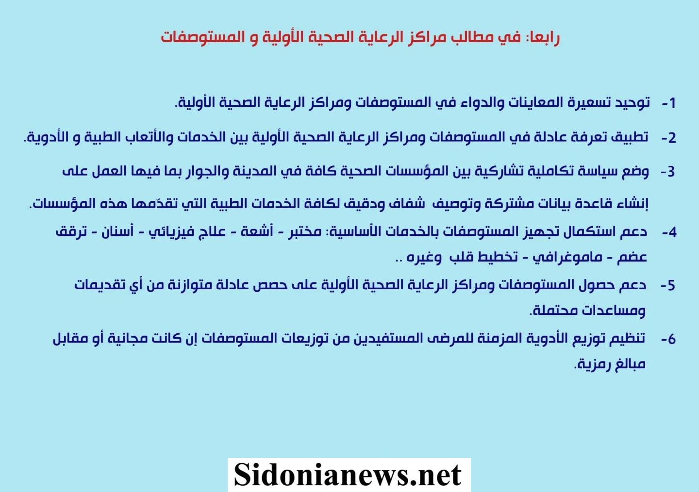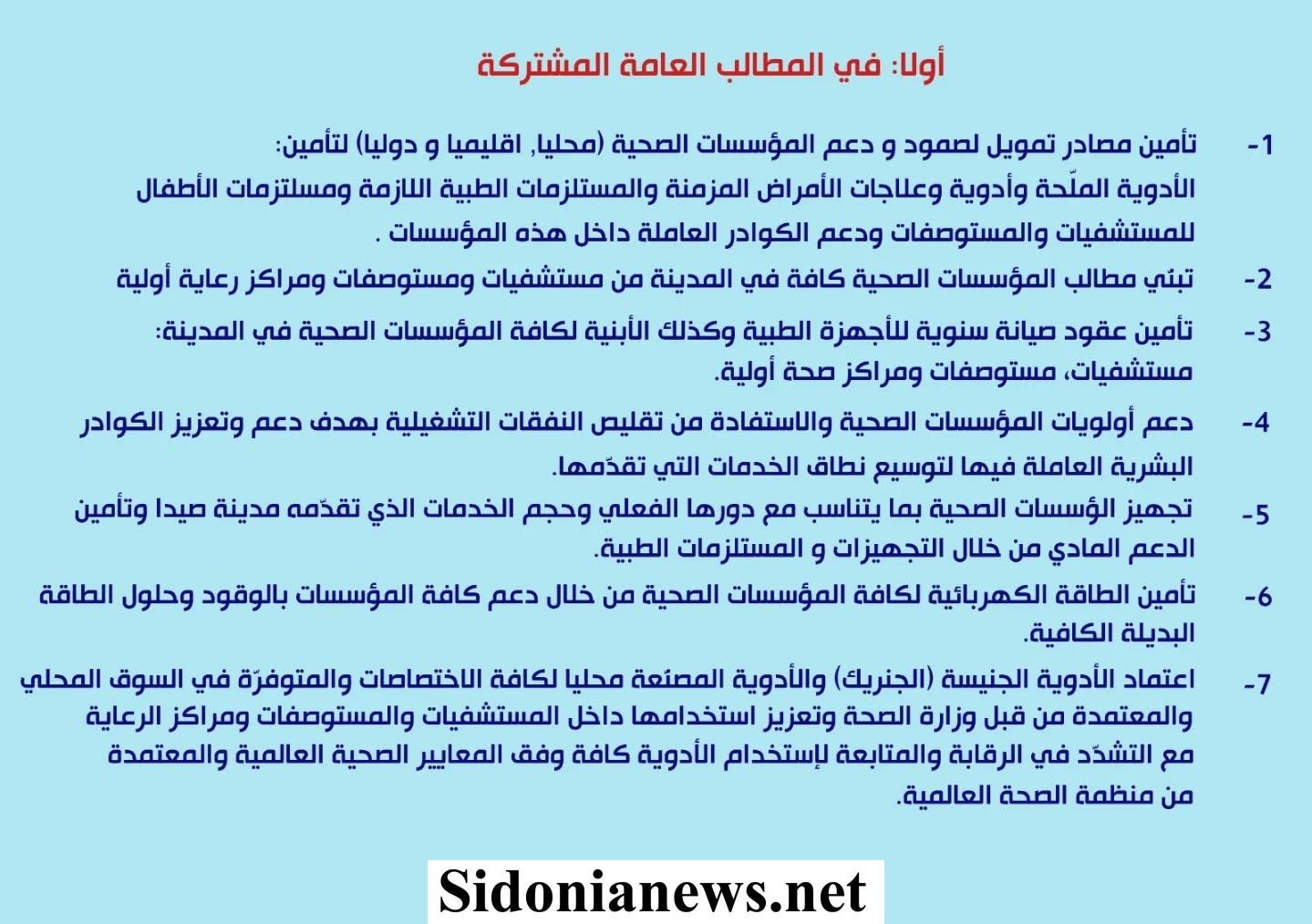 تمحورت هذه المطالب والتوصيات على أهمية دعم صمود المؤسسات الصحية كافة في المدينة من خلال التجهيزات و المستلزمات الطبية و تطوير الأقسام الموجودة مع إستحداث أقسام جديدة وفق الحاجة.