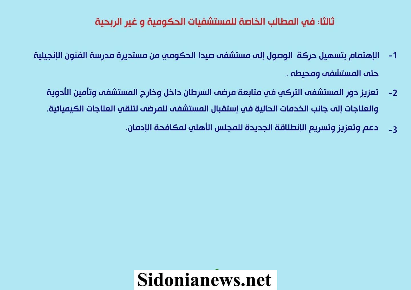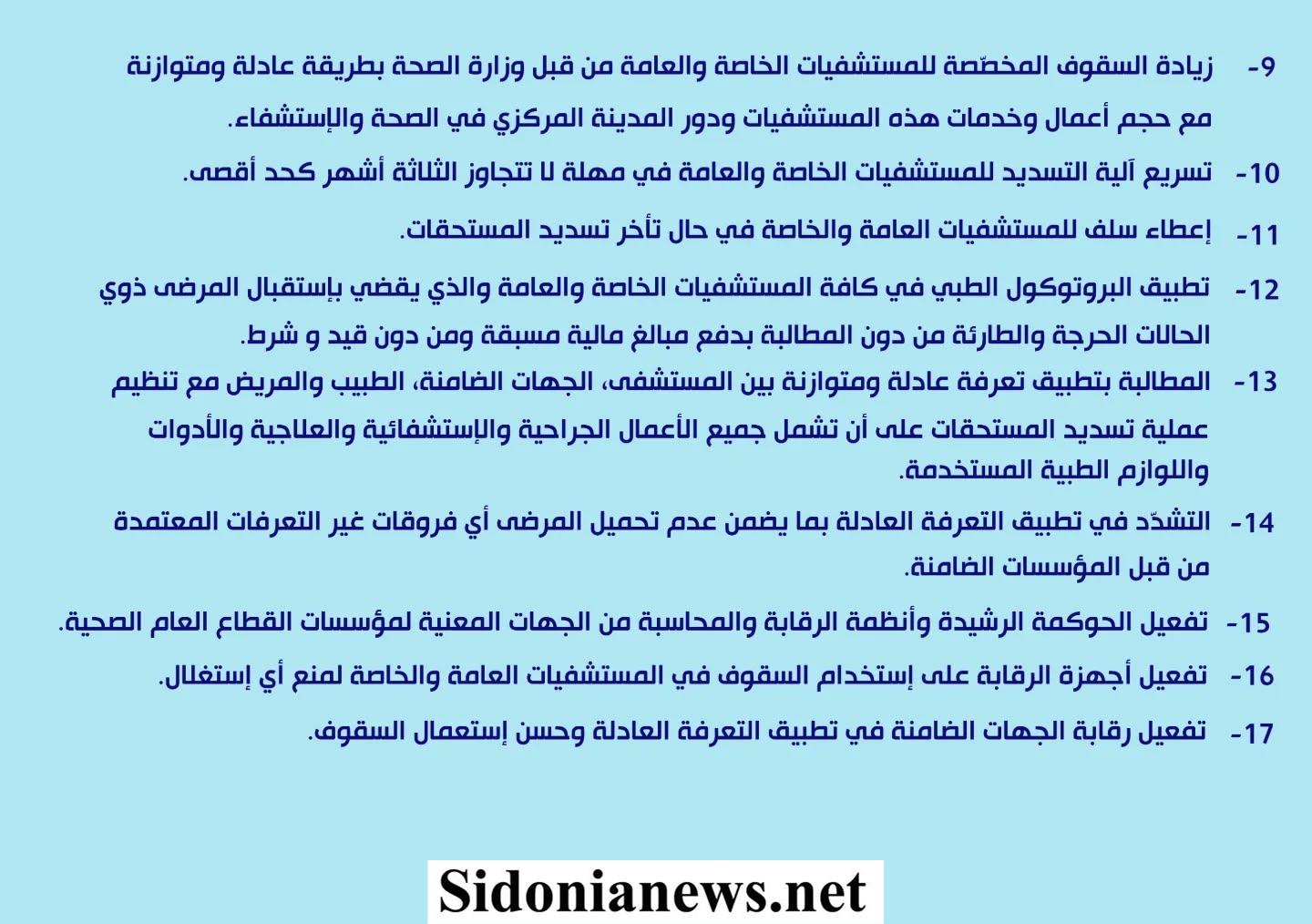 في الجلسة الختامية لمؤتمر صيدا الصحي الاول، عرض رئيس لجنة الصحة في بلدية صيدا د. تيسير الزعتري جملة من المطالب و التوصيات و التي تهدف إلى تأمين أوسع نطاق خدمات صحية، طبية و إستشفائية شاملة للجميع بجودة عالية وتكاليف عادلة و متوازنة.