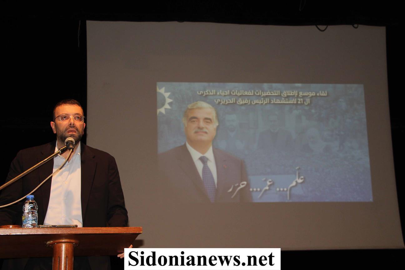 استهل اللقاء بالنشيد الوطني اللبناني وعرض فيديو عن الرئيس الشهيد من اعداد قطاع الشباب في منسقية صيدا والجنوب ، فكلمة ترحيب من المنسق مازن حشيشو قال فيها:" ليس سهلًا أن تمضي بكامل إنسانيّتك، خالعًا نعليك، متجرّدًا من أدنى ما يحول بين قدميك وأرض الواقع المفخخ أمنياً وسياسياً، مخاطبًا مصلحة الوطن بلغة البناء، وإن كلّفك الأمر ما لا يُقدَّر بثمن. على أي حال ، إن فعلت ذلك فأنت رفيق، وإن ورثت الحِمل فأنت سعد، وإن سرت على هذا النهج فأنت المستقبل".