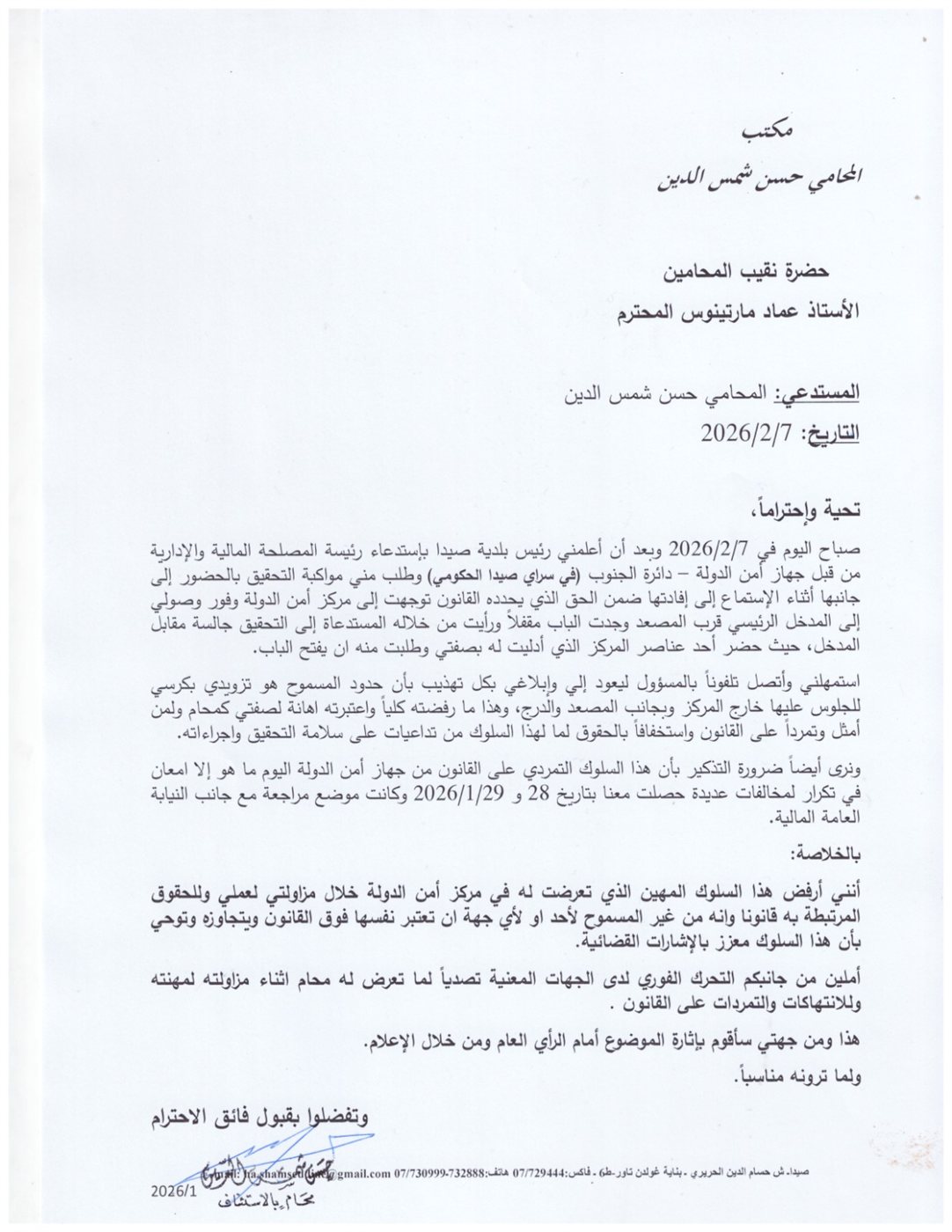 المحامي حسن شمس الدين يرفع كتابا الى نقيب المحامين عماد مارتينوس يشرح فيه ما حصل معه في سرايا صيدا خلال قيامه بممارسة مهنته كمحام لبلدية صيدا ومواكبته للتحقيقات الجارية