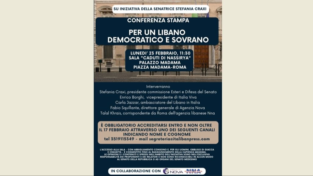 بدورها، دعت رئيسة لجنة العلاقات الدولية في مجلس الشيوخ الإيطالي ستيفانيا كراكسي بالتعاون مع وكالة "نوفا" و "الوكالة الوطنية للإعلام" في روما الى لقاء صحافي في 23 شباط الحالي يتعلق بلبنان،  في حضور سفيرة لبنان في ايطاليا كارلا جزار  وعدد من اعضاء لجنة العلاقات الدولية والدفاع من مختلف الأحزاب الإيطالية  وبمشاركة الزميل طلال خريس مراسل الوكالة الوطنية للإعلام في روما ولدى الكرسي الرسولي.  كما سبشارك في اللقاء مدير وكالة نوفا فابيو سكويللنتي.