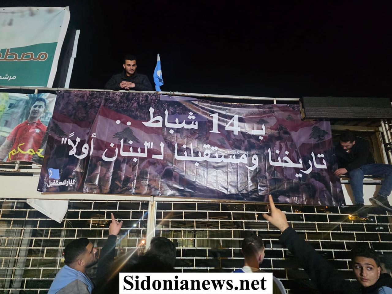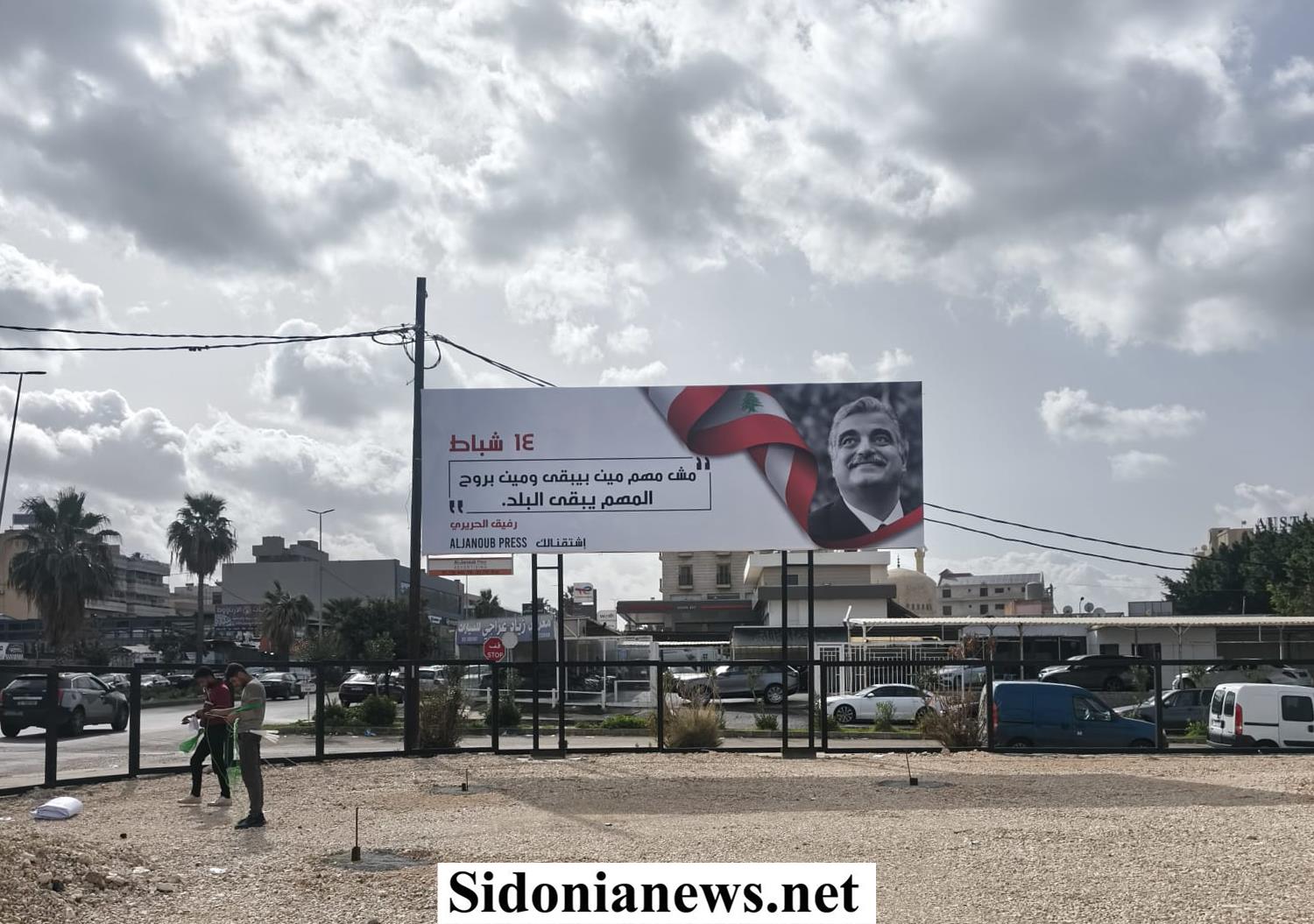 فقد رفع "تيار المستقبل – منسقية صيدا والجنوب" لافتات بالمناسبة جاء فيها : بـ 14 شباط .. نُجدد العهد لرفيق وسعد، بـ 14 شباط .. نحفظ "التاريخ" ونصنع "المستقبل" ، تاريخنا "شهادة" من أجل "السيادة" ، تاريخنا "إعمار" مش "دمار"، تاريخنا ومستقبلنا لـ"لبنان أولاً" ، تاريخنا ومستقبلنا لـ"الدولة أولاً"، تاريخنا ومستقبلنا لـ"العروبة أولاً"، تاريخنا ومستقبلنا "الاعتدال"، المستقبل" قدامنا .. بـ 14 شباط، تاريخنا" رفيق .. و"مستقبلنا" سعد ..
