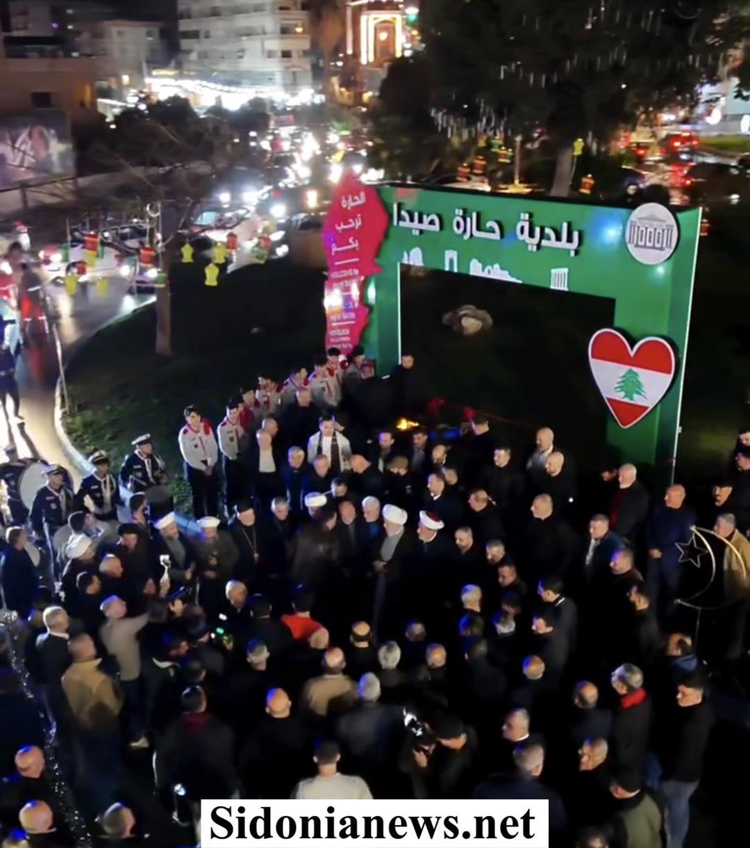 وتوجّه المشاركون سيراً على الأقدام إلى مستديرة البلدة حيث جرى قص شريط الافتتاح وإضاءة الزينة التي تضمّنت مجسّم مدفع رمضان وصخرة كُتب عليها "بلدة حارة صيدا".