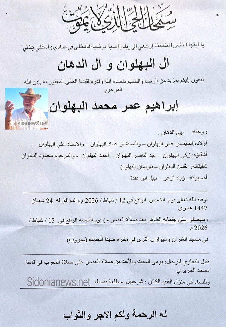 اليوم الأحد 15-2-2026 ذكرى ثالث المرحوم الناشط إبراهيم عمر محمد البهلوان ، أحد رواد ممشى الرياضة في مدينة الرئيس الشهيد رفيق الحريري الرياضية في مدينة صيدا ، باعتباره مرفقا هاما للتنزه أيضا للأفراد والعائلات والزوار من صيدا وكافة المناطق.