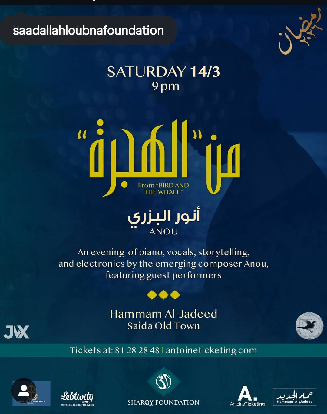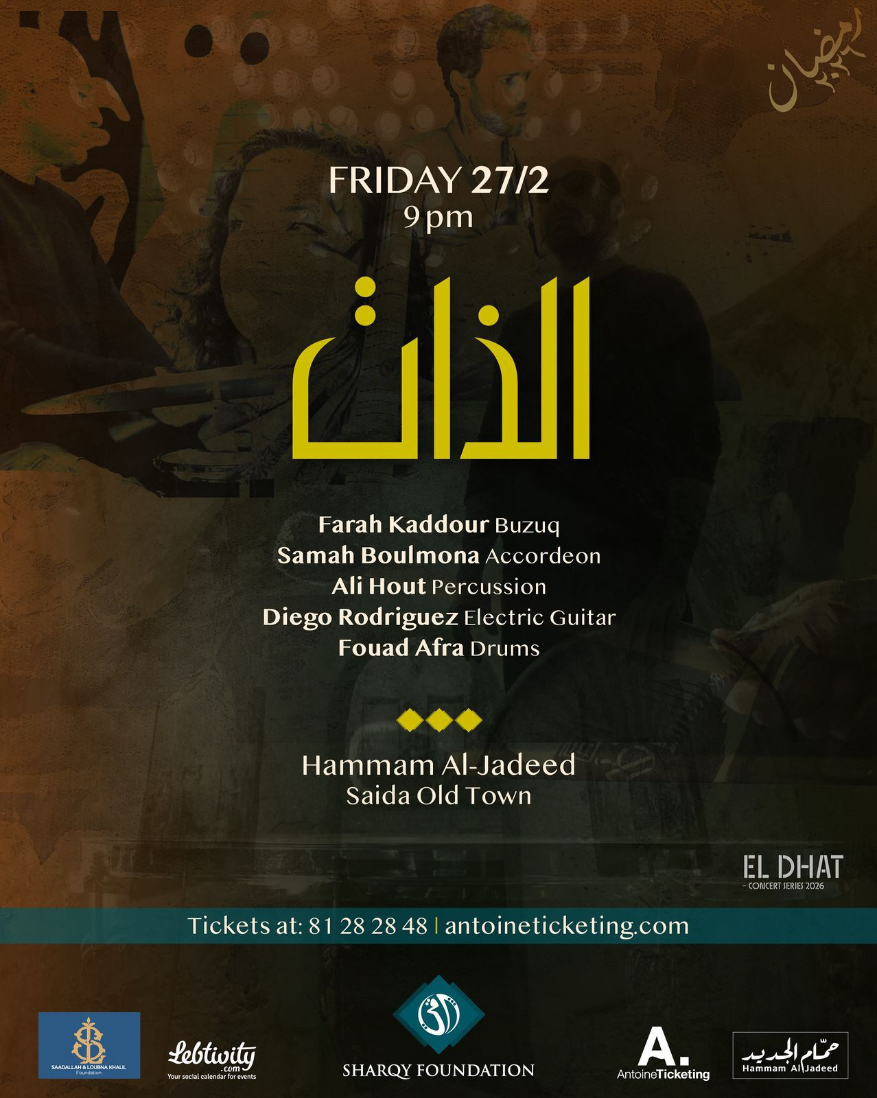 تطلق "مؤسسة شرقي للإنماء والإبتكار الثقافي" مساء الجمعة 27 شباط 2026 في "حمام الجديد " بصيدا القديمة أولى فعاليات برنامج امسياتها الفنية والتراثية لشهر رمضان المبارك للعام 2026 ، بأمسية موسيقية ارتجالية شرقية – أندلسية بعنوان " الذات" يحييها عازفون من لبنان وأسبانيا، وتقدم لأول مرة في الجنوب .