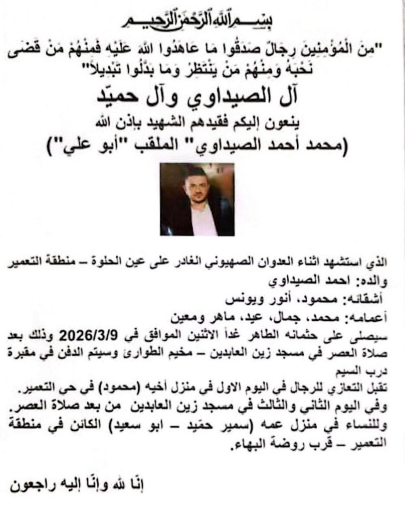 وأسفرت الغارة عن إستشهاد الشاب محمد أحمد الصيداوي حيث صدر بيان نعي العائلة لتشييعه نهار غد الإثنين 9-3-2026 ويوارى في الثرى في مقبرة درب السيم - عين الحلوة.