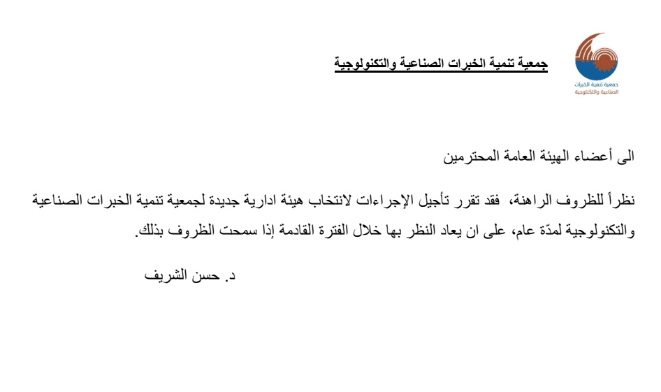 جريدة صيدونيانيوز.نت / إلى أعضاء الهيئة العامة في جمعية تنمية الخبرات الصناعية والتكنولوجية : تقرر تأجیل إنتخابات هیئة إدارية جديدة