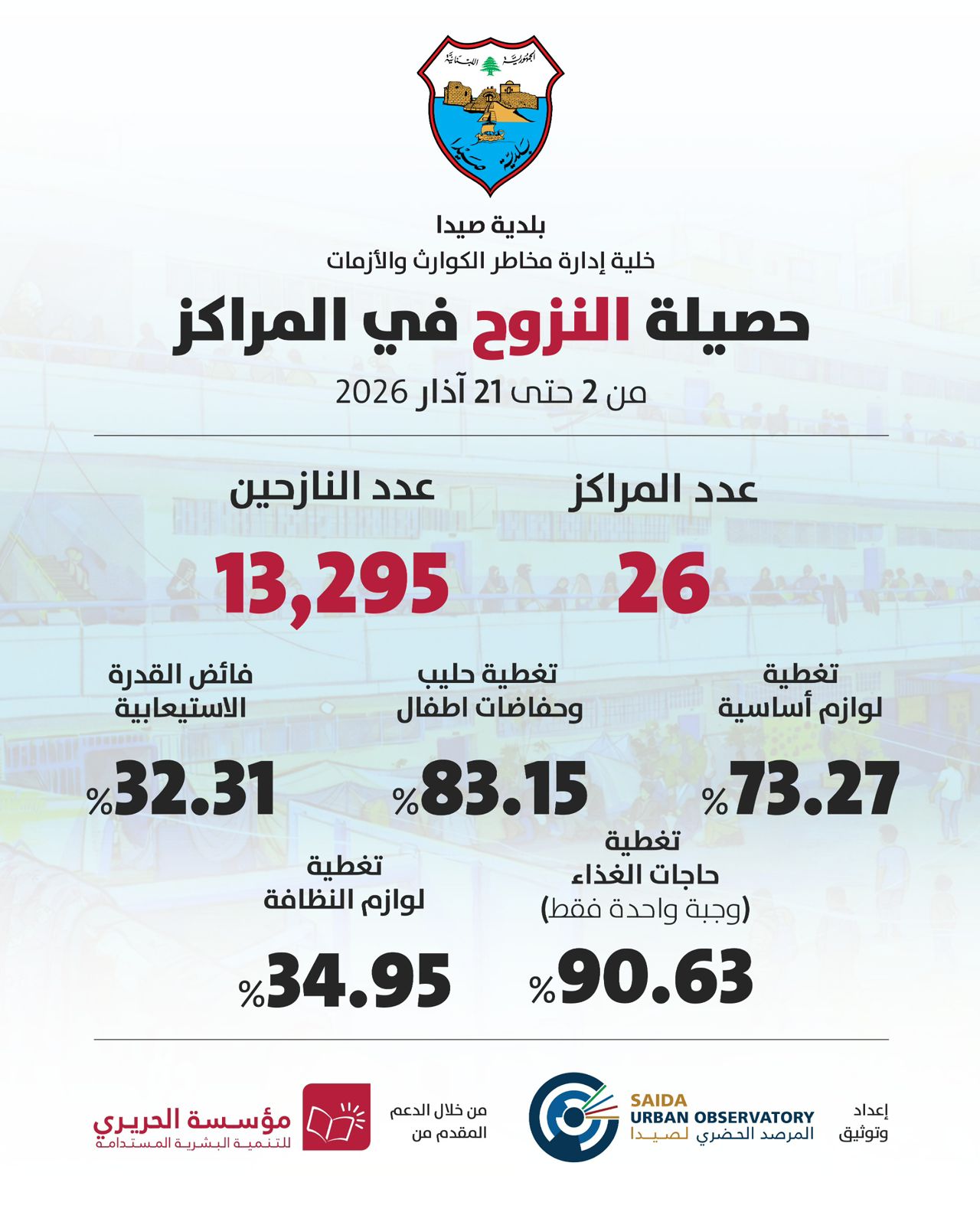 وعن نِسب ما تتم تغطيته حالياً من احتياجات النازحين في المراكز ، يقول حجازي إنها تتوزع على الشكل التالي : الغذاء (وجبة واحدة فقط): نسبة التغطية 90.63%.، حليب وحفاضات الأطفال: نسبة التغطية إلى 83.15% ، واللوازم الأساسية: النسبة 73.27%.. وحالياً المساعدات المتعلقة بالمواد الغذائية تقدم بشكل أساسي من مجلس الجنوب ومن الجمعيات الأهلية في المدينة والتي لا تقصر أبداً، إضافة الى ما تقدمه الجمعيات من مواد ووجبات غذائية .
