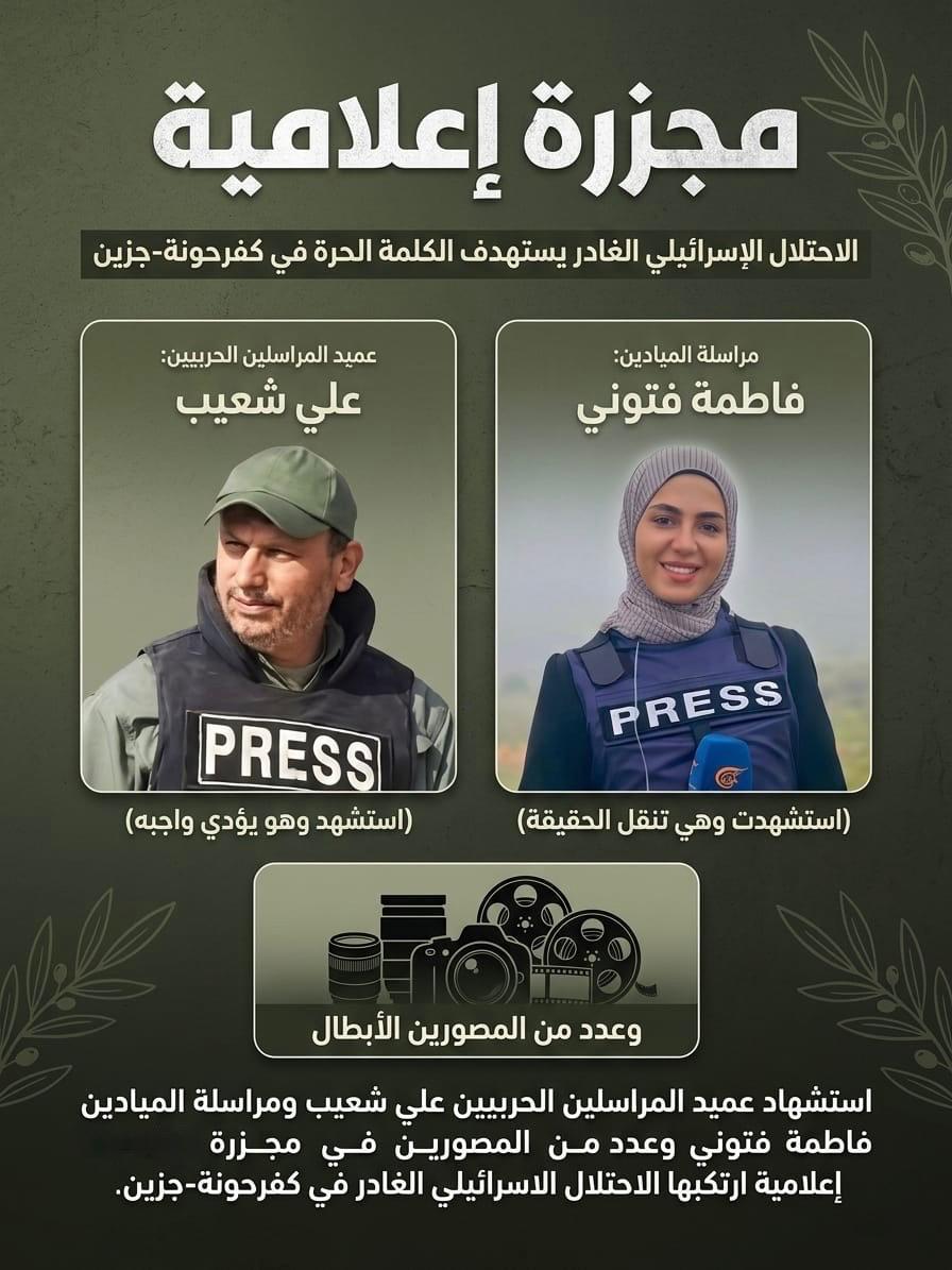 إن استهداف الإعلاميين، ومن بينهم الصحفي علي شعيب، مراسل قناة المنار، والصحفية فاطمة فتوني، يُشكّل اعتداءً صارخًا على حرية الصحافة، وانتهاكًا فاضحًا لكل القوانين والأعراف الدولية التي تكفل حماية الصحفيين في الميدان.