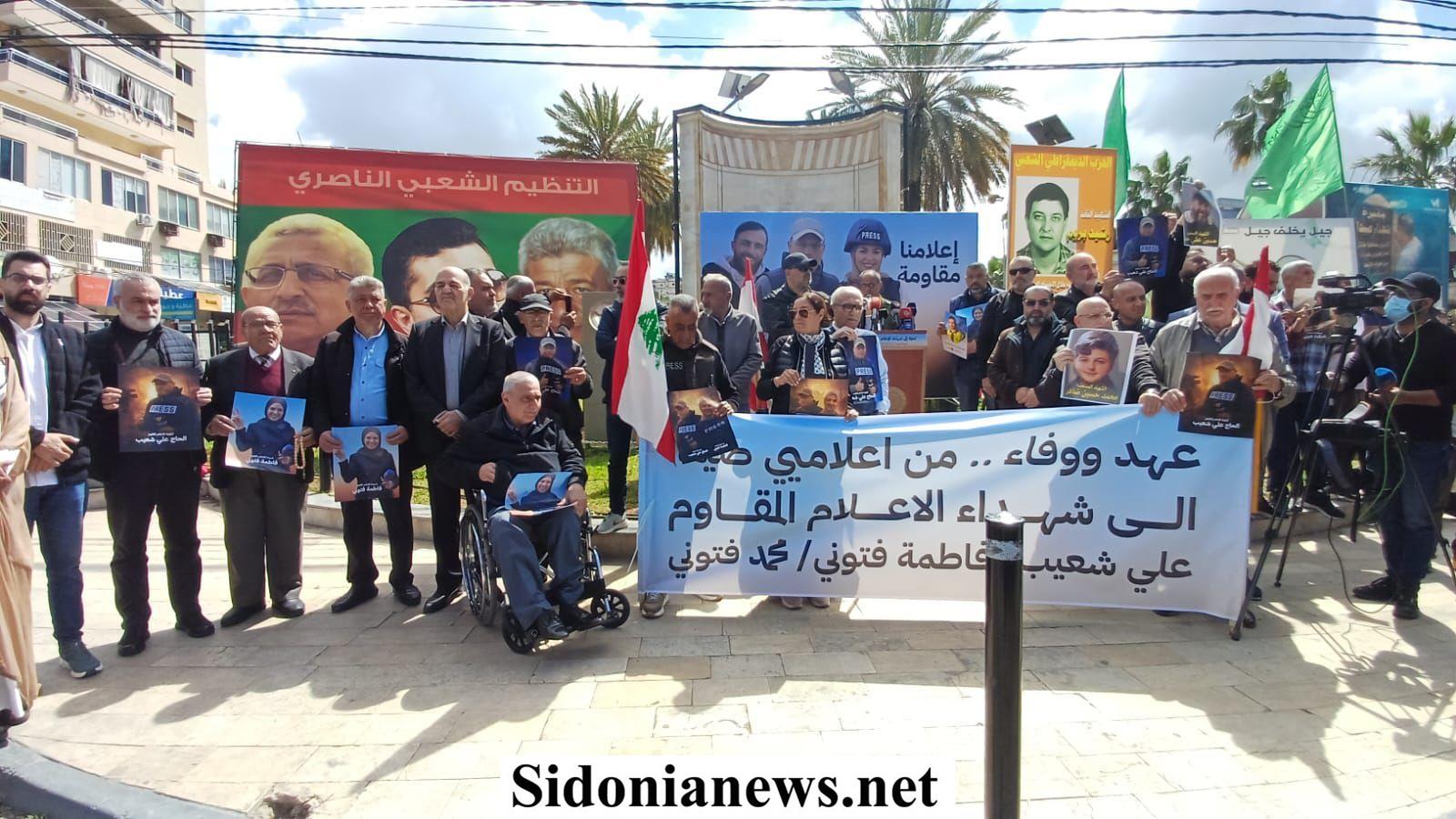 بالصور : وقفة إعلامية - سياسية تضامنية في ساحة شهداء صيدا تنديدا بجريمة الإحتلال الإسرائيلي إغتيال الإعلاميين علي شعيب وفطمة ومحمد فتوني في جنوب لبنان