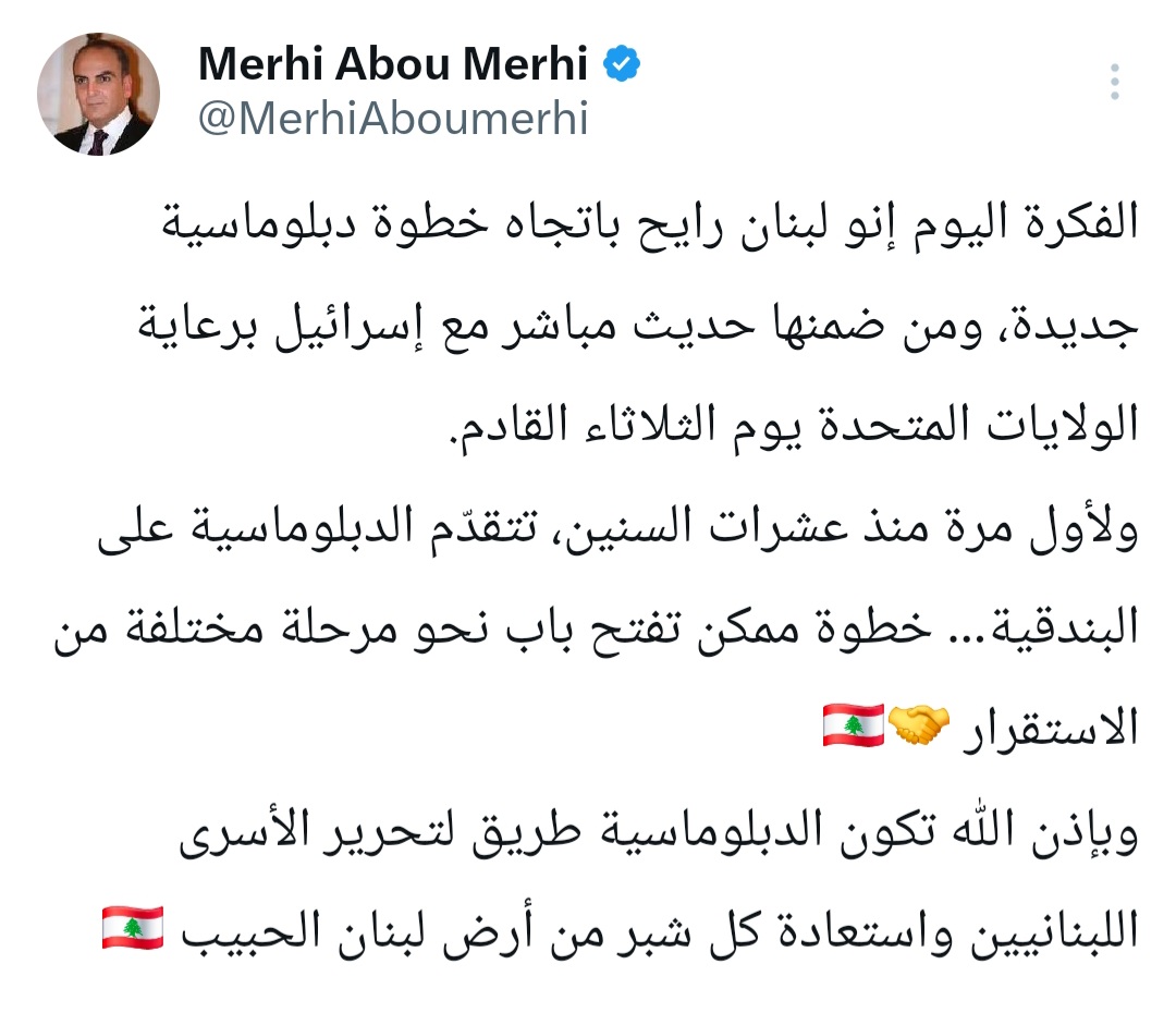 مرعي أبو مرعي على منصة أكس : لأول مرة منذ عشرات السنين تتقدّم الدبلوماسية على البندقية في لبنان
