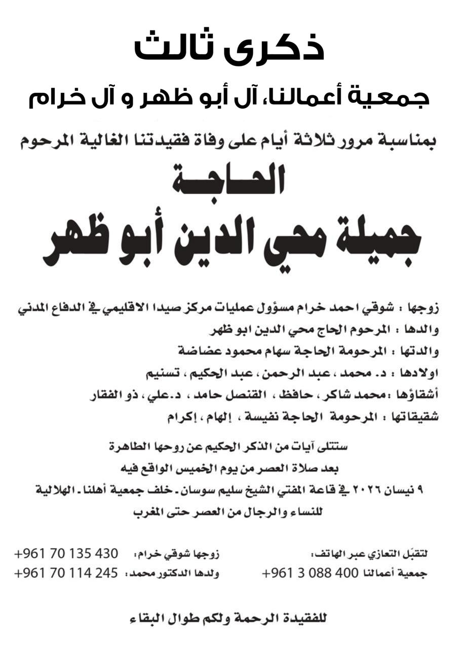 باسم جمعية "أعمالنا" ورئيسها القنصل د. حامد أبو ظهر ، وبإسم عائلة أبوظهر وآل خرام وعضاضة، نتوجه بالشكر بإسم عائلة فقيدتنا الغالية المرحومة الحاجة جميلة محي الدين أبوظهر، إلى كل من واسانا بفقدانها وبهذا المصاب الأليم رحمها الله .