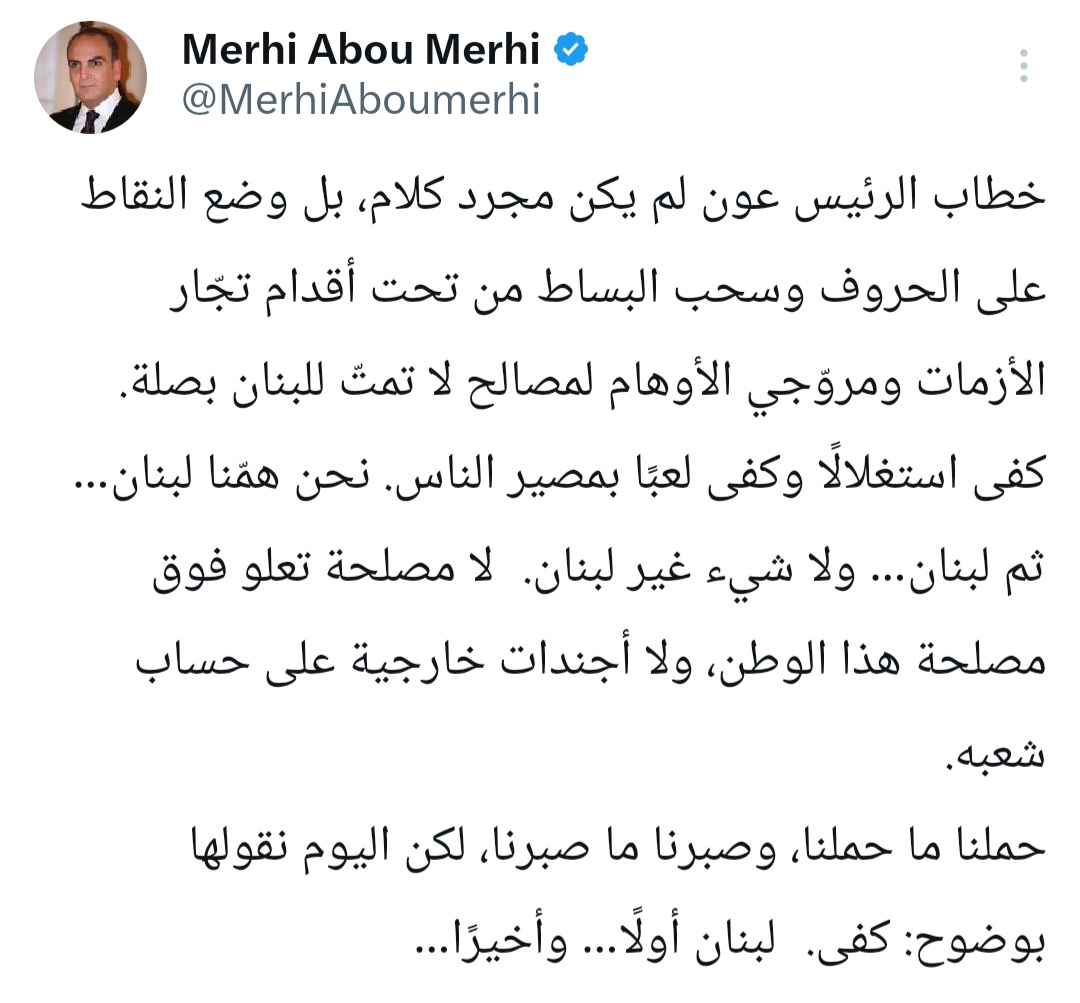كفى استغلالًا وكفى لعبًا بمصير الناس. نحن همّنا لبنان… ثم لبنان… ولا شيء غير لبنان. لا مصلحة تعلو فوق مصلحة هذا الوطن، ولا أجندات خارجية على حساب شعبه.