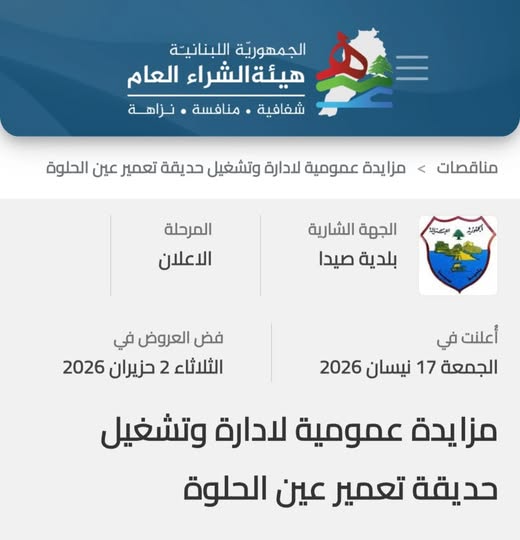 بناء عليه، تدعو بلدية صيدا كافة الشركات المتخصصة والراغبة في المشاركة بهذه المزايدة، بوجوب الاطلاع على كافة التفاصيل والشروط وتحميل المستندات المطلوبة عبر زيارة الرابط المخصص لهذه المناقصة على الموقع الإلكتروني الرسمي لهيئة الشراء العام من خلال الرابط التالي: