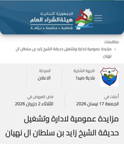تعلن بلدية صيدا عن طرح مزايدة عمومية عبر منصة هيئة الشراء العام، تهدف تشغيل حديقة الشيخ زايد بن سلطان ال نهيان ، وذلك وفقاً للمواصفات والشروط الواردة في دفتر الشروط الخاص بالصفقة، الموجود ادناه.
