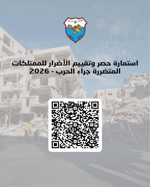 في إطار حرص بلدية صيدا على توثيق الأضرار الناتجة عن الاعتداءات الإسرائيلية التي طالت المدينة بعد تاريخ ٢\٣\٢٠٢٦، واستنادًا إلى الحاجة لتحديث قاعدة بيانات دقيقة وشاملة، تمهيدًا لمتابعة الملفات مع الجهات المختصة والمعنية بالتعويض وإعادة التأهيل، وبناءً على التنسيق والتعاون مع مجلس الجنوب، تدعو بلدية صيدا جميع المواطنين الذين تضرّرت ممتلكاتهم (ضمن نطاق بلدية صيدا الاداري حصرا)، سواء الوحدات السكنية أو غير السكنية (محال تجارية، مؤسسات، مستودعات، وغيرها)، إلى المبادرة بشكل عاجل إلى تعبئة الاستمارة الخاصة بالأضرار، وفق النموذج المعتمد المرفق في الرابط.