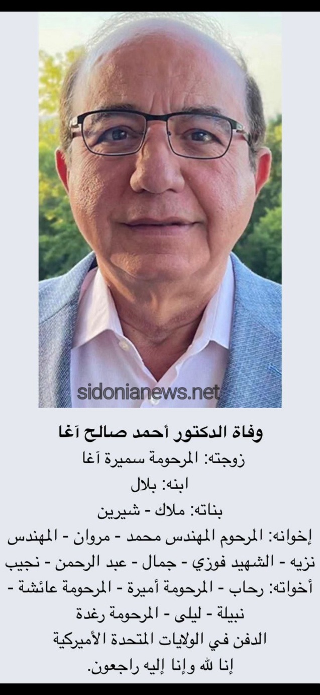 وفاة الدكتور أحمد صالح آغا في الولايات المتحدة الأميركية - 27-9-2025 آل آغا (وفيات صيدا لبنان - جريدة صيدونيانيوز.نت)