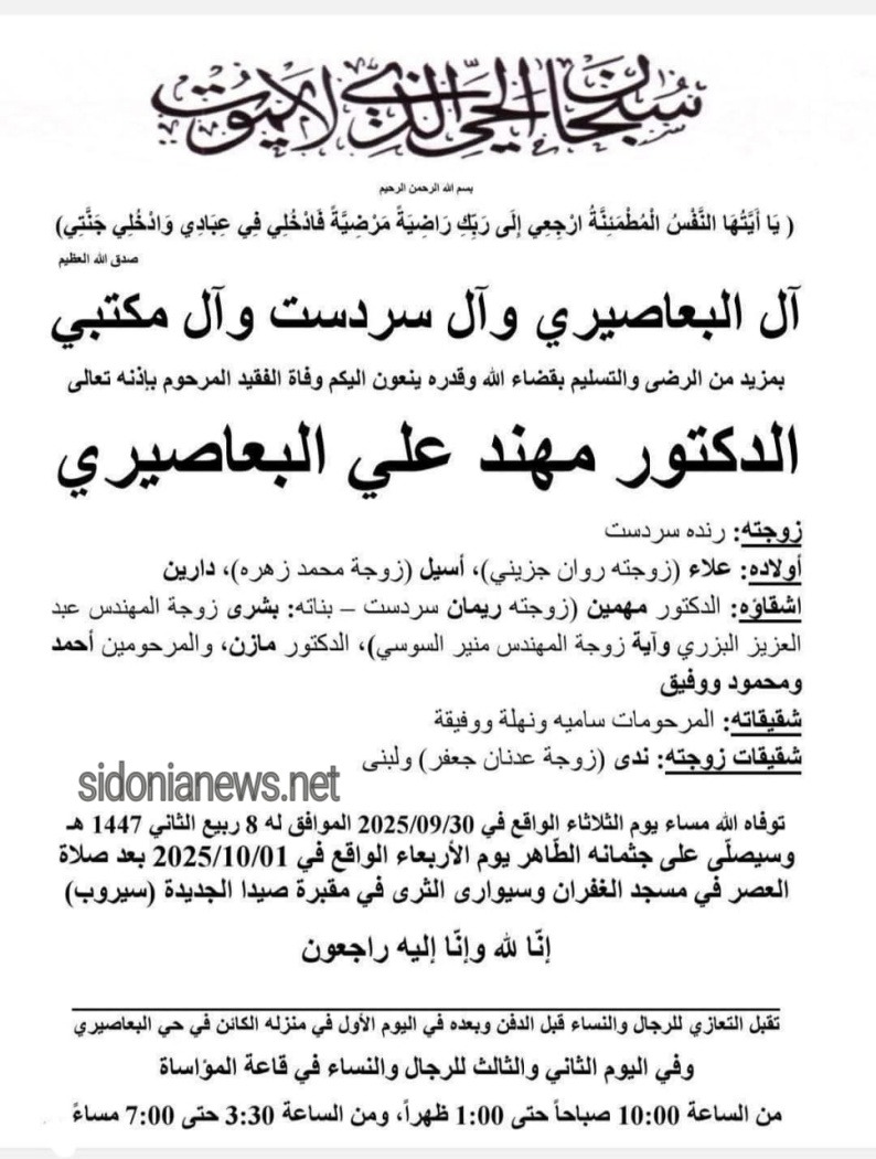 وفاة الدكتور مهند علي البعاصيري 1-10-2025 آل البعاصيري وسردست ومكتبي وجزيني وزهرة والبزري والسوسي وجعفر (وفيات صيدا لبنان - جريدة صيدونيانيوز.نت)