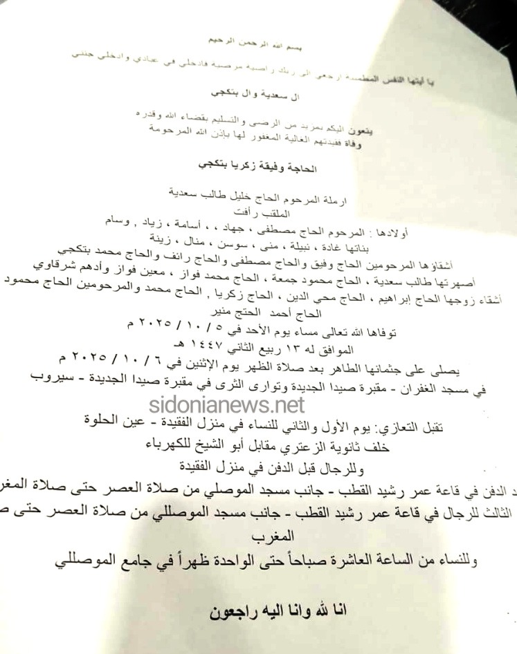 جريدة صيدونيانيوز.نت / وفاة الحاجة وفيقة زكريا بتكجي -6-10-2025 آل سعدية وبتكجي (وفيات صيدا لبنان -جريدة صيدونيانيوز.نت)