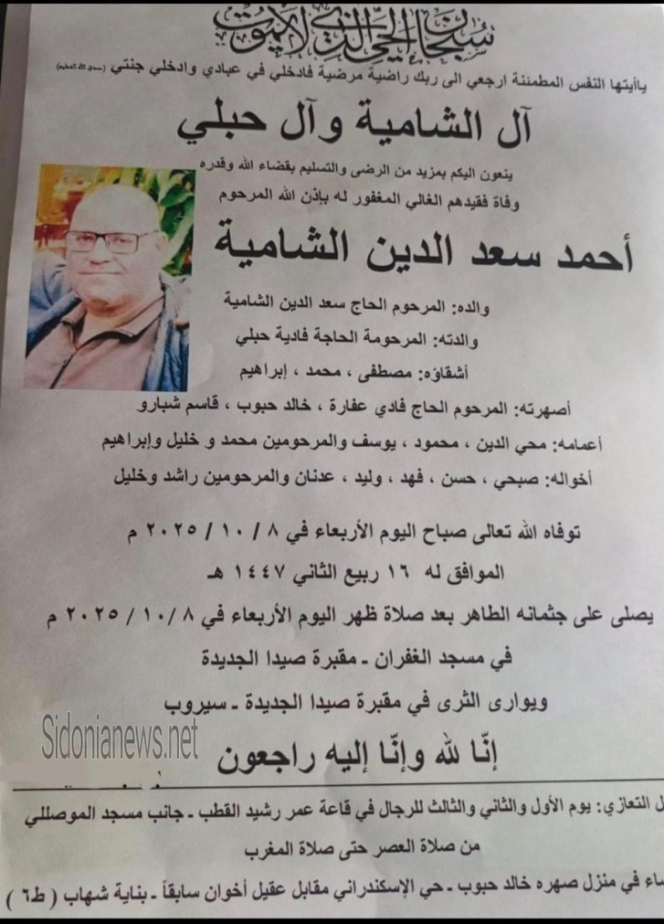جريدة صيدونيانيوز.نت / وفاة أحمد سعدالدين الشامية 8-10-2025 آل الشامية وحبلي (وفيات صيدا لبنان - جريدة صيدونيانيوز.نت) 2025-10-08 Sidonianews.net ------------ وفاة أحمد سعدالدين الشامية 8-10-2025 آل الشامية وحبلي (وفيات صيدا لبنان - جريدة صيدونيانيوز.نت) 2025-10-08