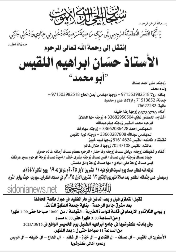 وفاة الأستاذ حسان إبراهيم اللقيس 13-10-2025- التعازي في صيدا وكفرشوبا- آل اللقيس وعساف وخباز وغانم والحاج وخليفة والريس (وفيات صيدا كفرشوبا لبنان - جريدة صيدونيانيوز.نت)