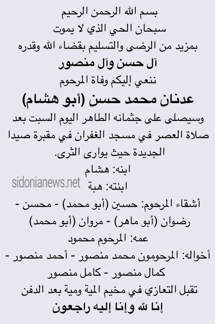 وفاة عدنان محمد حسن 25-10-2025 آل حسن ومنصور (وفيات صيدا - الميه وميه - لبنان - فلسطين - جريدة صيدونيانيوز.نت)