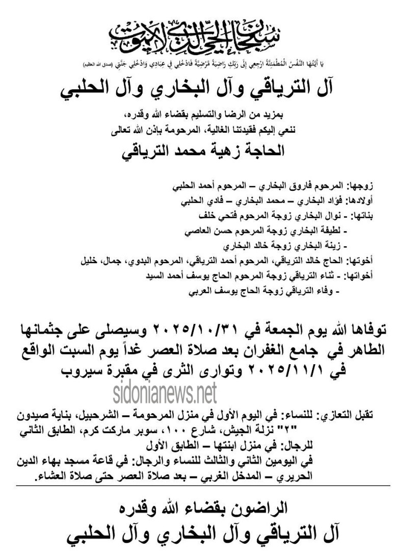 جريدة صيدونيانيوز.نت / وفاة الحاجة زهية محمد الترياقي -1-11-2025 آل الترياقي والبخور والحلبي (وفيات صيدا لبنان - جريدة صيدونيانيوز.نت ) 2025-10-31 Sidonianews.net ----------- وفاة الحاجة زهية محمد الترياقي -1-11-2025 آل الترياقي والبخور والحلبي (وفيات صيدا لبنان - جريدة صيدونيانيوز.نت ) 2025-10-31