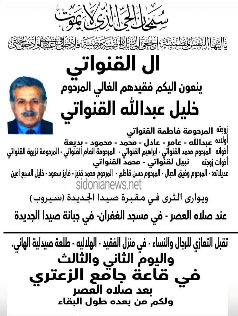 جريدة صيدونيانيوز.نت / وفاة خليل عبدالله القنواتي 1-11-2025 آل القنواتي والحبال وقاظم وقنبز وسعود والسبع أعين (وفيات صيدا – لبنان – صيدونيانيوز.نت)