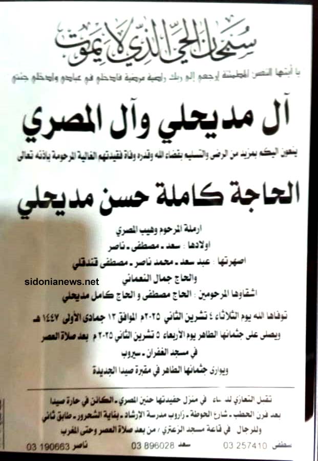 وفاة الحاجة كاملة حسن مديحلي 5-11-2025 آل مديحلي والمصري وسعد وناصر وقندقلي والنعماني (وفيات حارة صيدا – صيدا – لبنان – جريدة صيدونيانيوز.نت)