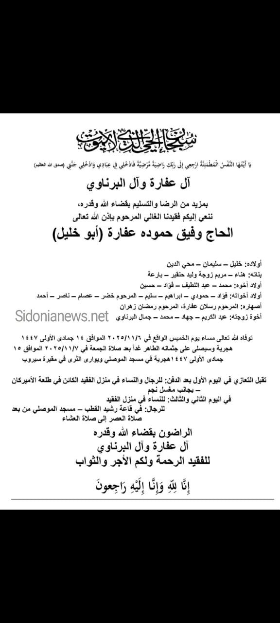وفاة الحاج وفيق حمودة عفارة -٧-١١-٢٠٢٥ -آل عفارة والبرناوي (وفيات صيدا لبان -جريدة صيدونيانيوز.نت)