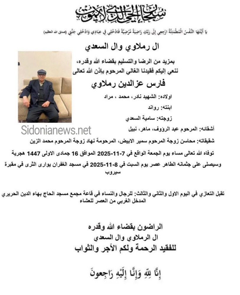 جريدة صيدونيانيوز.نت / وفاة فارس عزالدين رملاوي -8-11-2025 آل رملاوي والسعدي والأبيض والزين (وفيات صيدا - لبنان - صيدونيانيوز.نت) 2025-11-08 Sidonanews.net ---------------------- وفاة فارس عزالدين رملاوي -8-11-2025 آل رملاوي والسعدي والأبيض والزين (وفيات صيدا - لبنان - صيدونيانيوز.نت) 2025-11-08