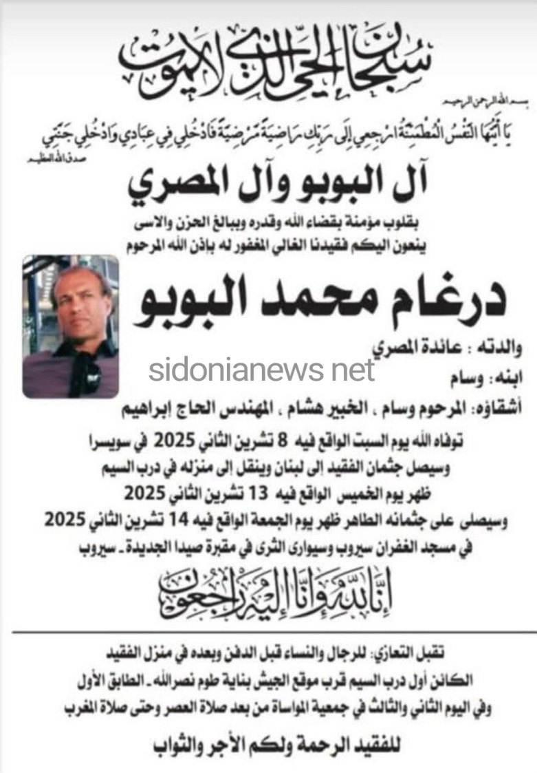 وفاة درغام محمد البوبو -توفاه الله في سويسرا والدفن في صيدا الخميس 13-11-2025 آل البوبو والمصري (وفيات صيدا – لبنان – جريدة صيدونيانيوز.نت)
