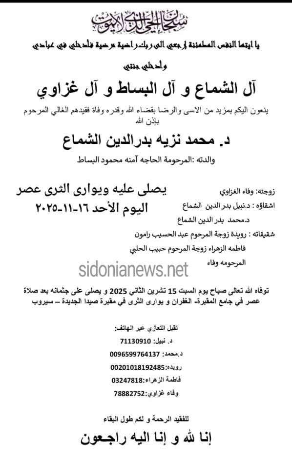 وفاة د. محمد نزيه بدر الدين الشماع 15-11-2025-الدفن عصر ١٦-١١-٢٠٢٥- آل الشماع والبساط وغزاوي ورامون والحلبي (وفيات صيدا – لبنان – جريدة صيدونيانيوز.نت )