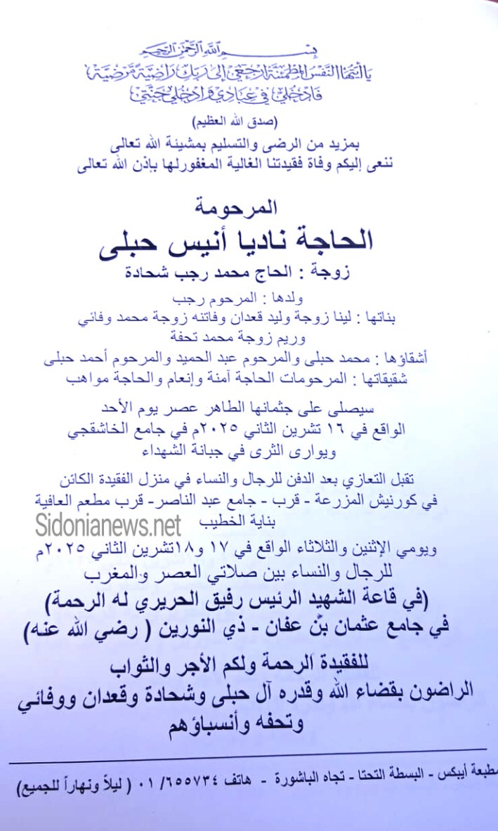 جريدة صيدونيانيوز.نت / وفاة الحاجة ناديا أنيس حبلي - الدفن عصر16-11-2025-(خالة المختار أحمد حبلي وشقيقه القائد الكشفي مروان حبلي ) ـ آل حبلي وشحادة وقعدان ووفائي وتحفة (وفيات صيدا - بيروت - لبنان - جريدة صيدونيانيوز.نت)