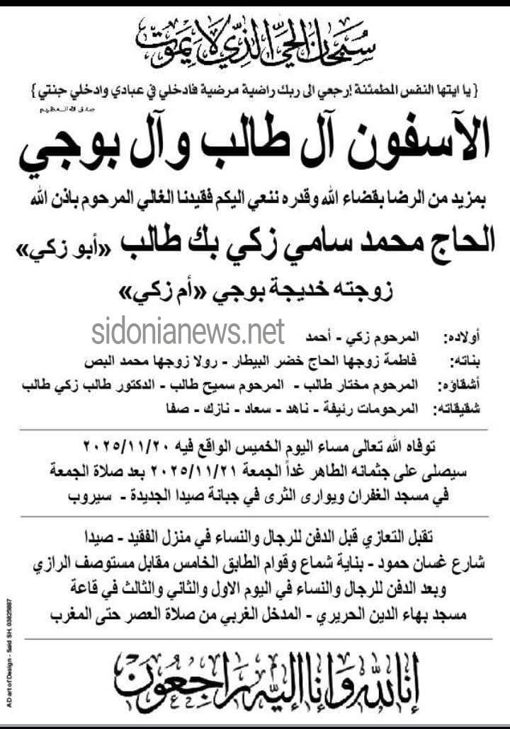 جريدة صيدونيانيوز.نت / وفاة الحاج محمد سامي زكي بك طالب - الدفن -- آل طالب وبوجي (وفيات صيدا لبنان - جريدة صيدونيانيوز.نت) 2025-11-20 Sidonianews.net ---------- وفاة الحاج محمد سامي زكي بك طالب - الدفن -- آل طالب وبوجي (وفيات صيدا لبنان - جريدة صيدونيانيوز.نت) 2025-11-20
