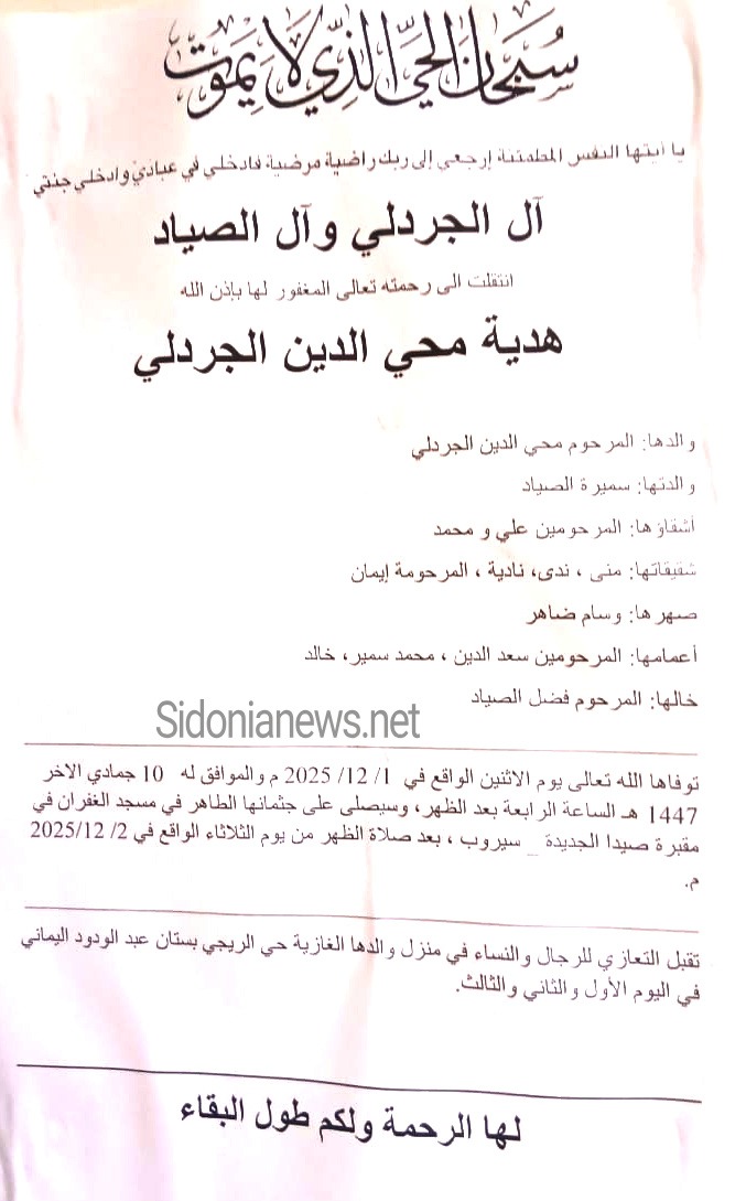 جريدة صيدونيانيوز.نت / وفاة هدية محي الدين الجردلي - 2-2-2025 - آل الجردلي والصياد 2025-12-02 Sidonianews.net 2025-12-02