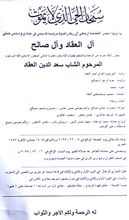 وفاة الشاب سعدالدين أحمد العقاد -٦-١٢-٢٠٢٥ -آل العقاد والصلح (وفيات صيدا لبنان جريدة صيدونيانيوز.نت)