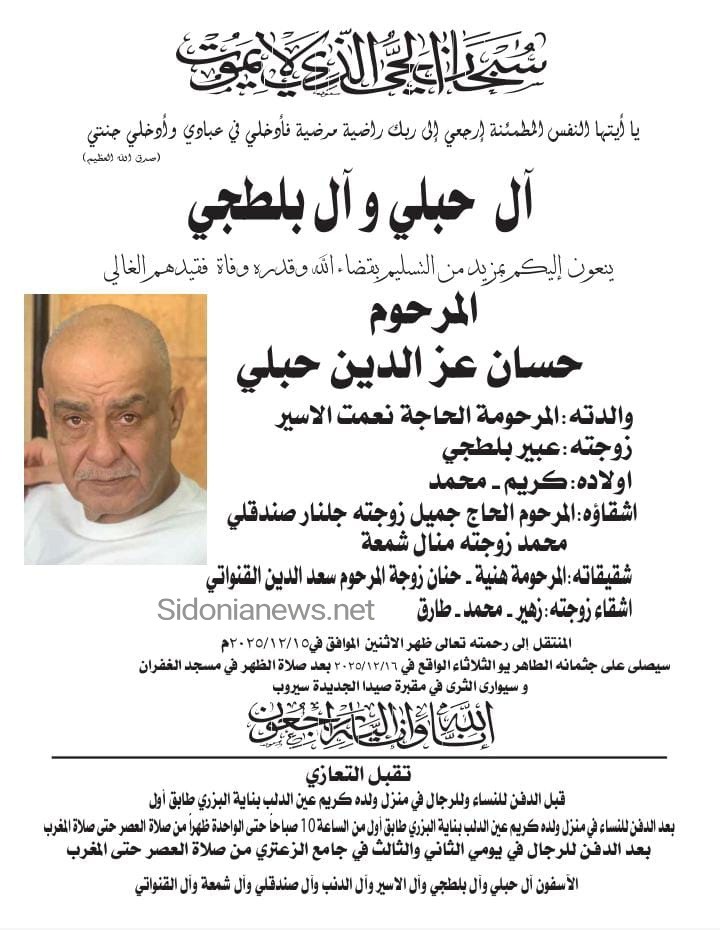 وفاة المرحوم حسان عزالدين حبلي - الدفن ظهر الثلاثاء 16-12-2025 آل حبلي وبلطجي والأسير وصندقلي وشمعة والقنواتي (وفيات صيدا لبنان - جريدة صيدونيانيوز.نت )