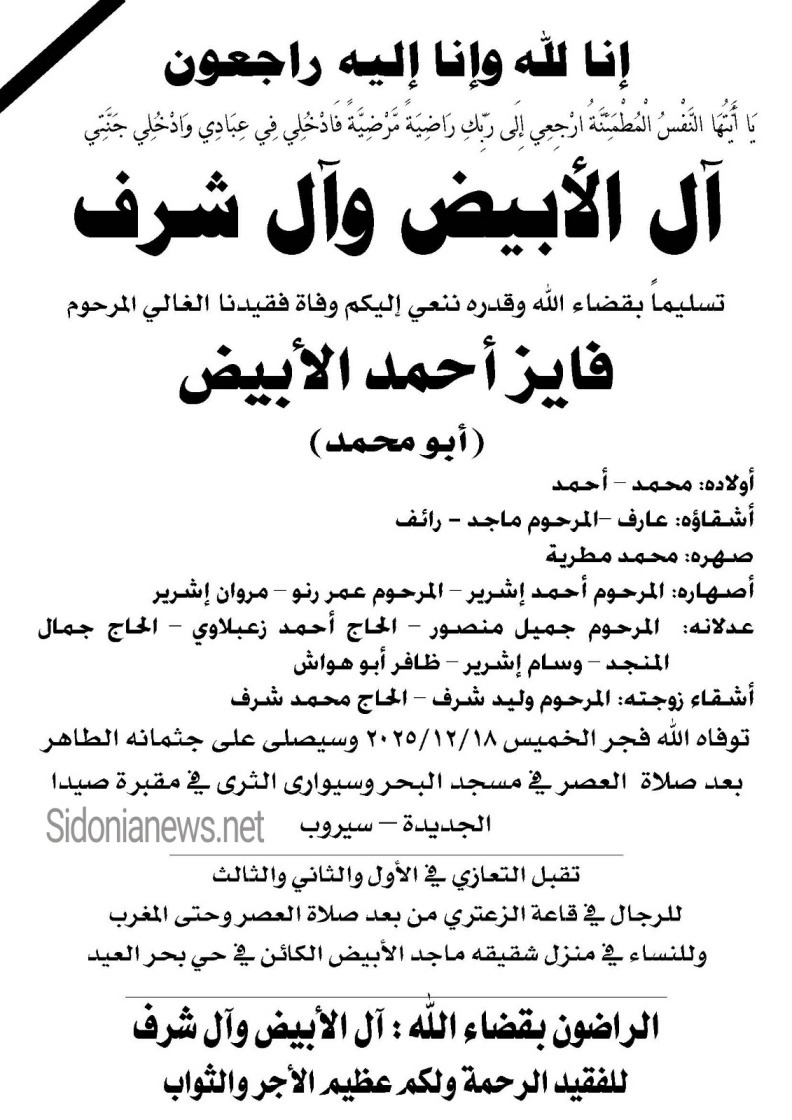 وفاة فايز أحمد الأبيض -18-12-2025 آل الأبيض وشرف ومطرية وإشرير ورنو ومنصور وزعبلاوي والمنجد وأبوهواش (وفيات صيدا لبنان - جريدة صيدونيانيوز.نت)