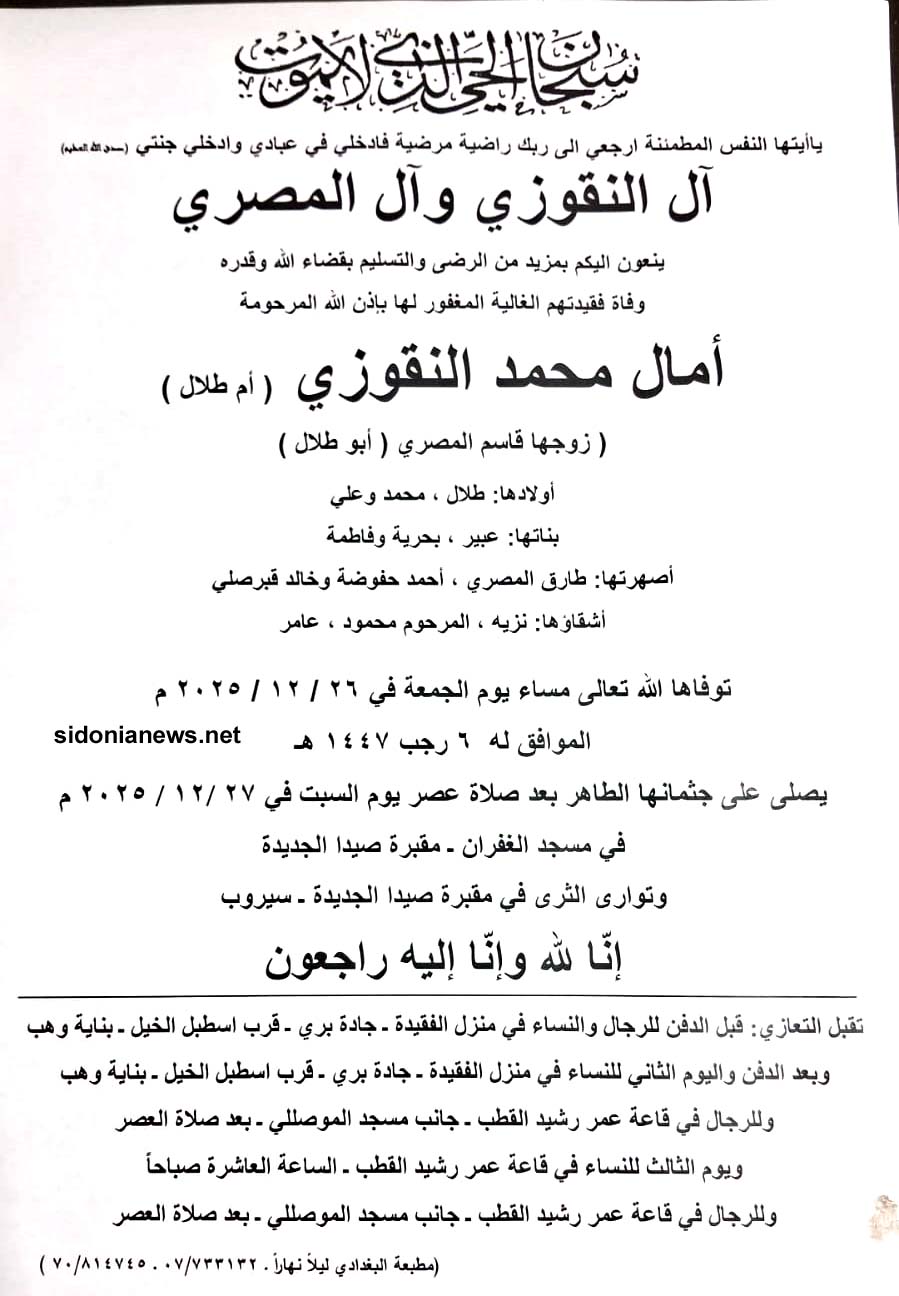 وفاة آمال محمد النقوزي (إم طلال ) 27-12-2025 آل النقوزي والمصري وحفوضة وقبرصلي (وفيات صيدا – لبنان – جريدة صيدونيانيوز.نت)