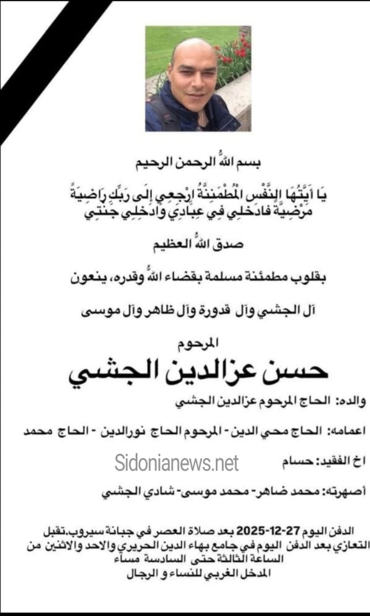 جريدة صيدونيانيوز.نت / وفاة حسن عزالدين الجشي 27-12-2025 آل الجشي وقدورة وظاهر وموسى (وفيات صيدا لبنان - جريدة صيدونيانيوز.نت) 2025-12-27 Sidonianews.net ---------- وفاة حسن عزالدين الجشي 27-12-2025 آل الجشي وقدورة وظاهر وموسى (وفيات صيدا لبنان - جريدة صيدونيانيوز.نت) 2025-12-27