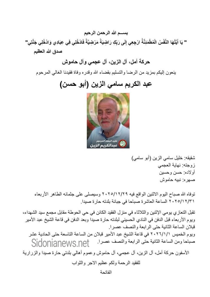 جريدة صيدونيانيوز.نت / وفاة عبدالكريم سامي الزين -29-12-2025 - الدفن 31-12-2025 حركة أمل وآل الزين وعجمي وحاموش (وفيات صيدا - حارة صيدا - لبنان - جريدة صيدونيانيوز.نت)