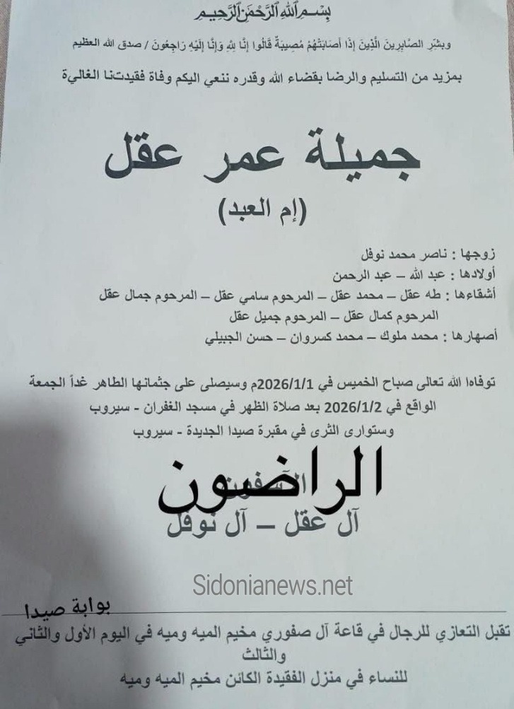 جريدة صيدونيانيوز.نت / وفاة جميلة عمر عقل -٢-١-٢٠٢٦ -آل عقل ونوفل وملوك وكسروان والجبيلي (وفيات صيدا لبنان -جريدة صيدونيانيوز.نت ) 2026-01-02 Sidonianews.net ---------------------- وفاة جميلة عمر عقل -٢-١-٢٠٢٦ -آل عقل ونوفل وملوك وكسروان والجبيلي (وفيات صيدا لبنان -جريدة صيدونيانيوز.نت ) 2026-01-02