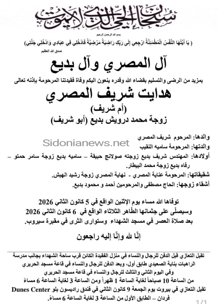 جريدة صيدونيانيوز.نت / وفاة هدايات شريف المصري - 6-1-2026 آل المصري وبديع (وفيات صيدا لبنان - جريدة صيدونيانيوز.نت) 2026-01-06 Sidonianews.net ------------ وفاة هدايات شريف المصري - 6-1-2026 آل المصري وبديع (وفيات صيدا لبنان - جريدة صيدونيانيوز.نت) 2026-01-06