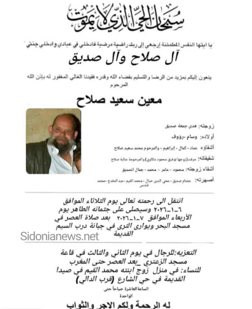 وفاة معين سعيد صلاح-7-1-2026 - آل صلاح وصديق وعكاوي وحبا والقيم والمقدح (وفیات صيدا لبنان -جریدة صيدونيانيوز.نت)