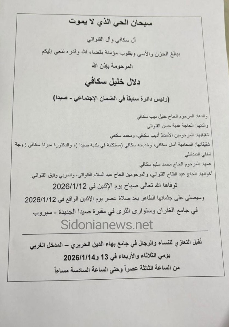وفاة دلال خليل سكافي (رئيس دائرة سابقا في الضمان الاجتماعي ) 12-1-2026 آل سكافي والقنواتي والدندشلي (وفيات صيدا – لبنان – جريدة صيدونيانيوز.نت)