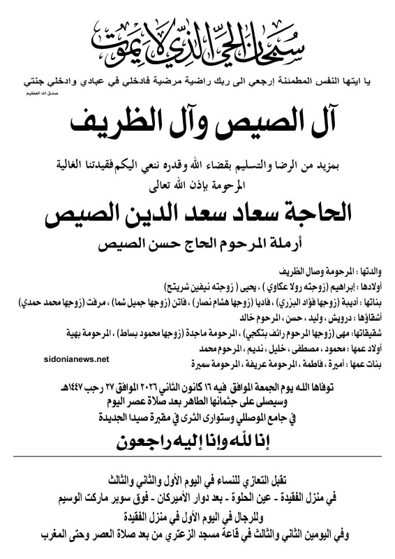 وفاة الحاجة سعاد سعد الدين الصيص 16-1-2026 آل الصيص والظريف وعكاوي وشريتح والبزري ونصار وشما وحمدي وبتكجي وبساط (وفيات صيدا – لبنان – جريدة صيدونيانيوز.نت)